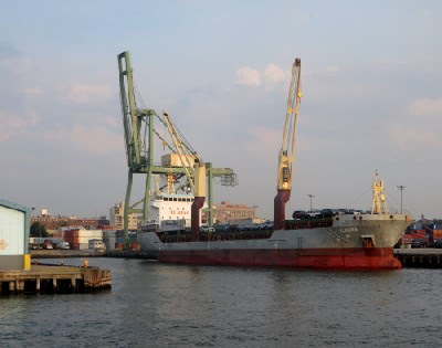 Laura, a small container carrying freighter, was at the Red Hook Container Port. The demise of this small port has been predicted for some years, as it lacks a railhead and vast acres of storage space, but most importantly, it sits on waterfront land desirable for residential development. Plans for expansion of container port operations in Brooklyn may save it.